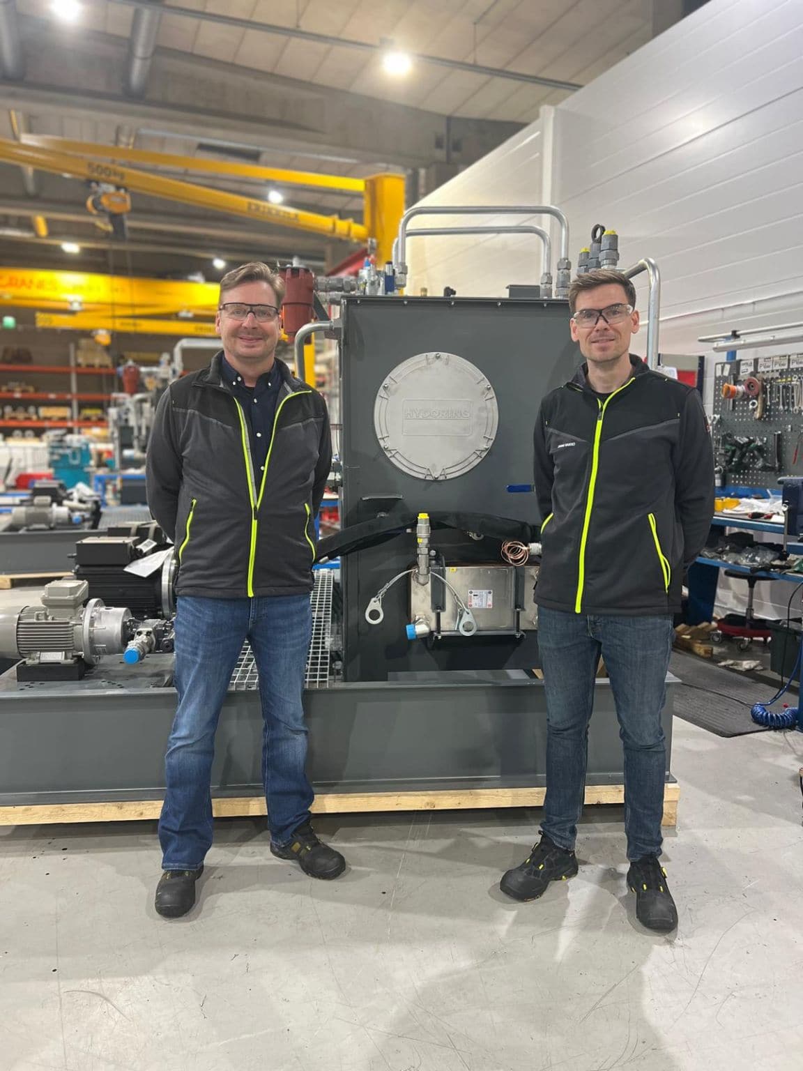 Kuvassa Kalle Lindgren ja Janne Raikko, kuvattuna Hydoringin koneikkotehtaalla Kyrössä.