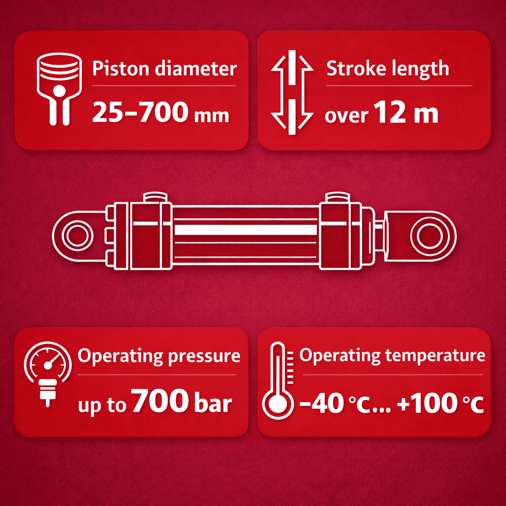 - Ø160–250 mm cylinders: nominal pressure 25 MPa (250 bar)